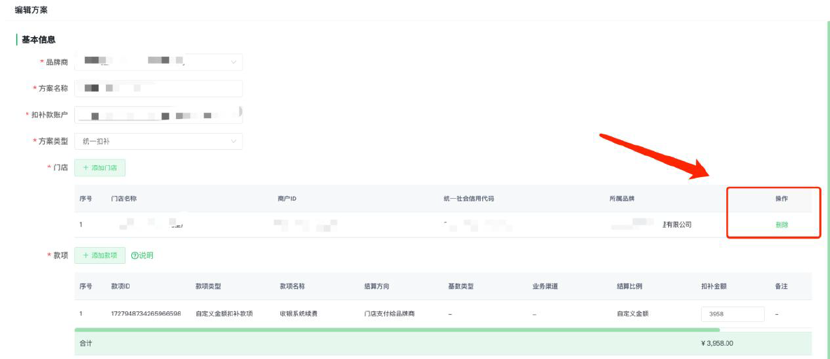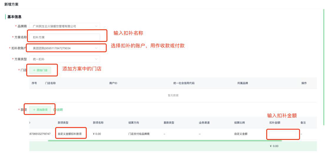 通过扣补方案执行需要门店向品牌支付,品牌向门店支付,门店向服务商支付的扣补动作