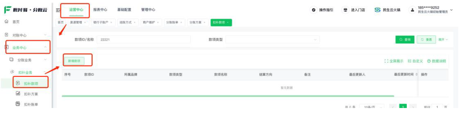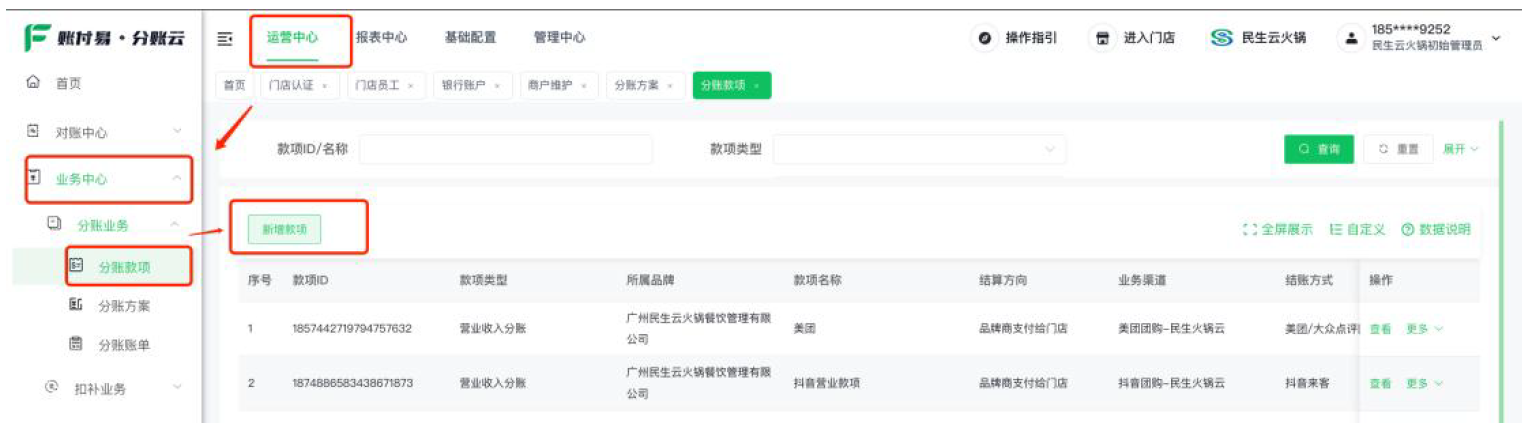 操作路径:账付易后台—运营中心—业务中心—分账业务—分账款项—新增款项