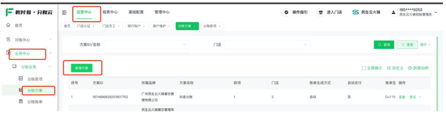 操作路径:账付易后台—运营中心—业务中心—分账业务—分账方案—新增方案