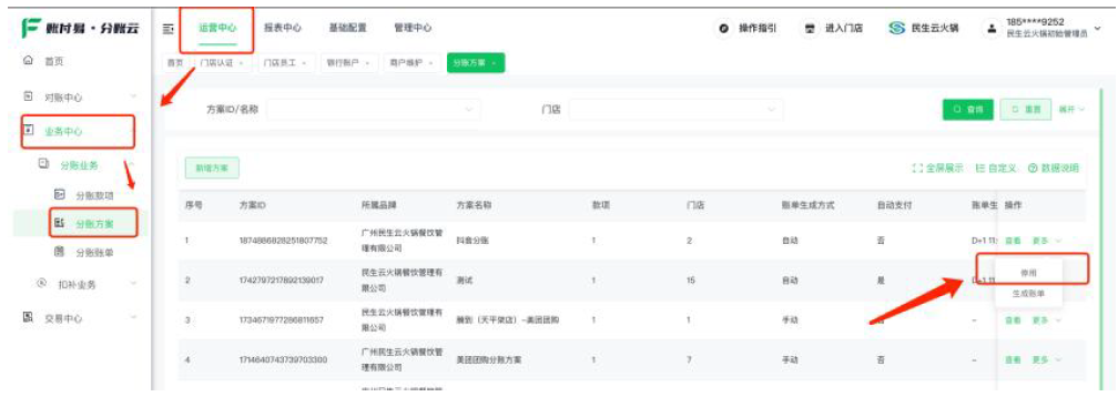 操作路径:账付易后台—运营中心—业务中心—分账业务—分账方案—方案操作—停用方案—进行编辑
