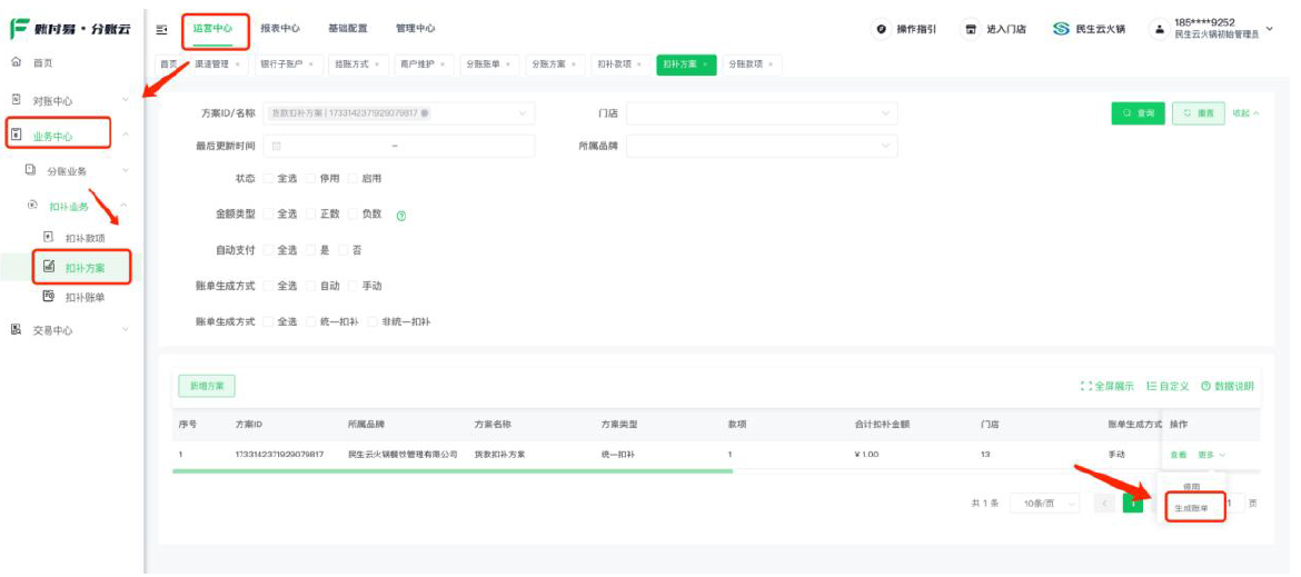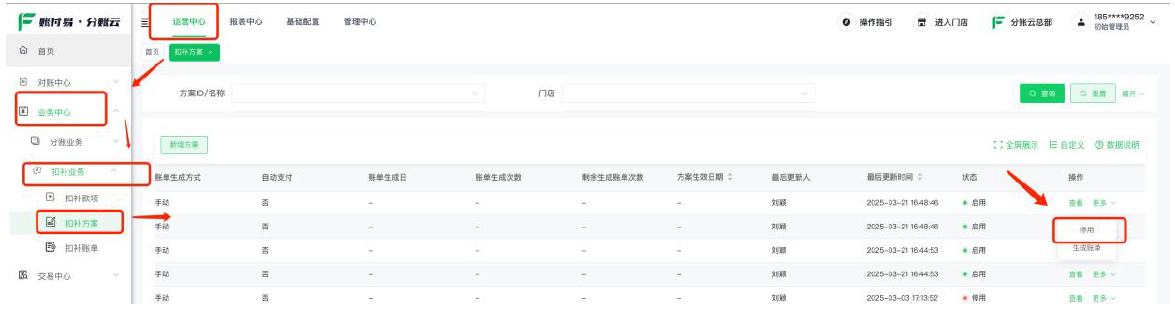 操作步骤:账付易后台—运营中心—业务中心—扣补方案—操作按钮更多—生成账单