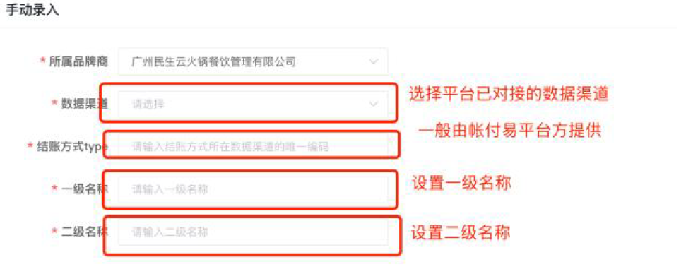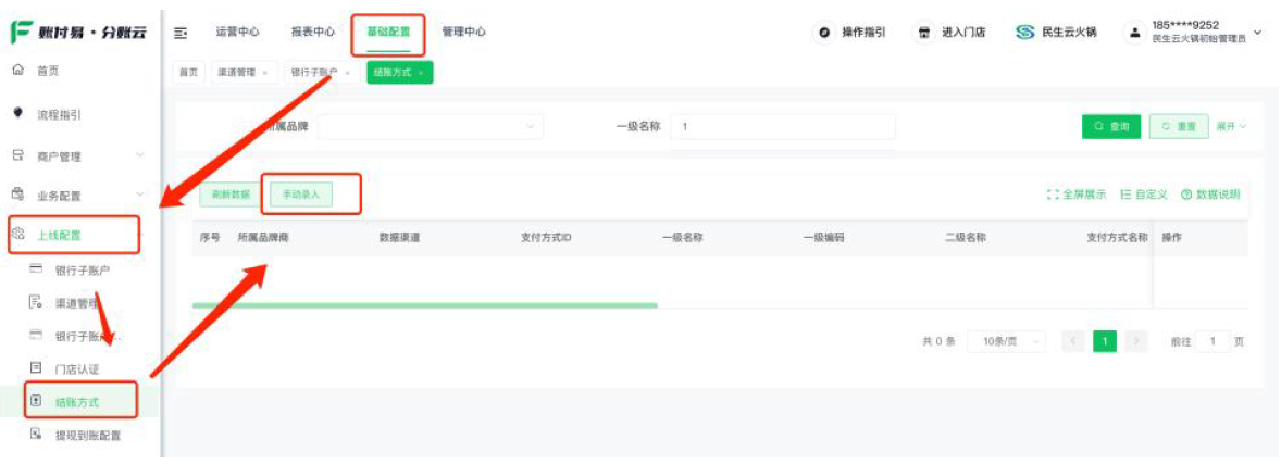 操作路径:账付易后台—基础配置—上线配置—结账方式—手工录入