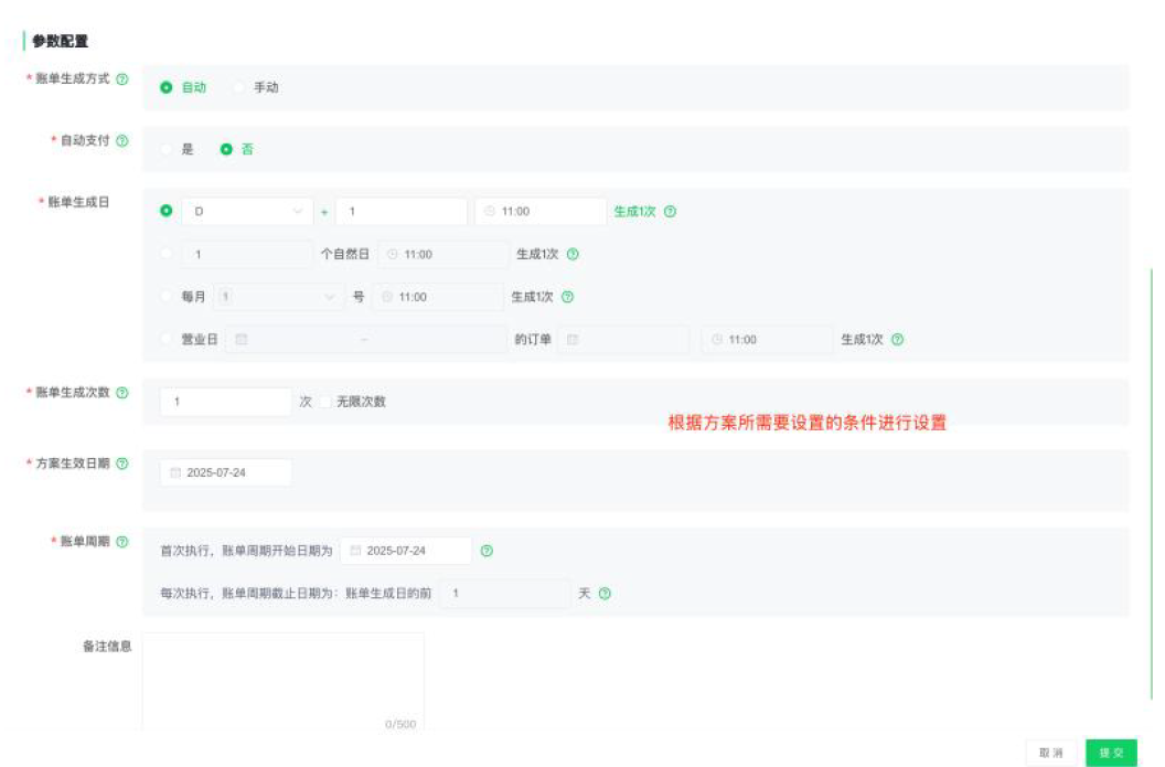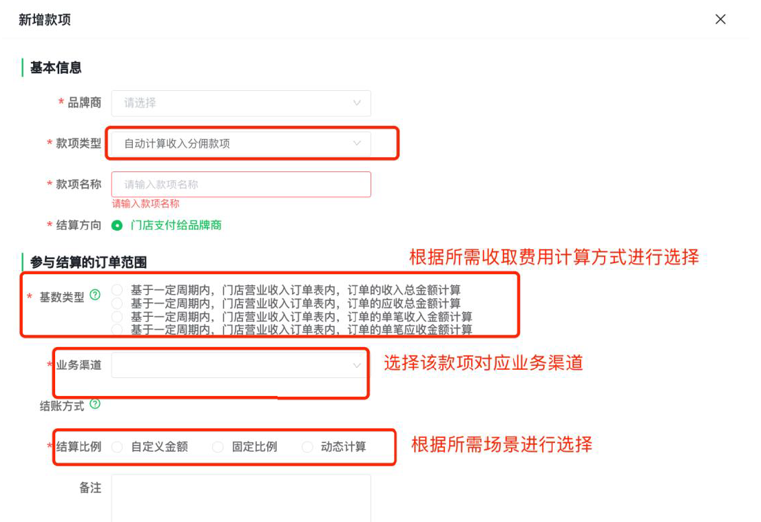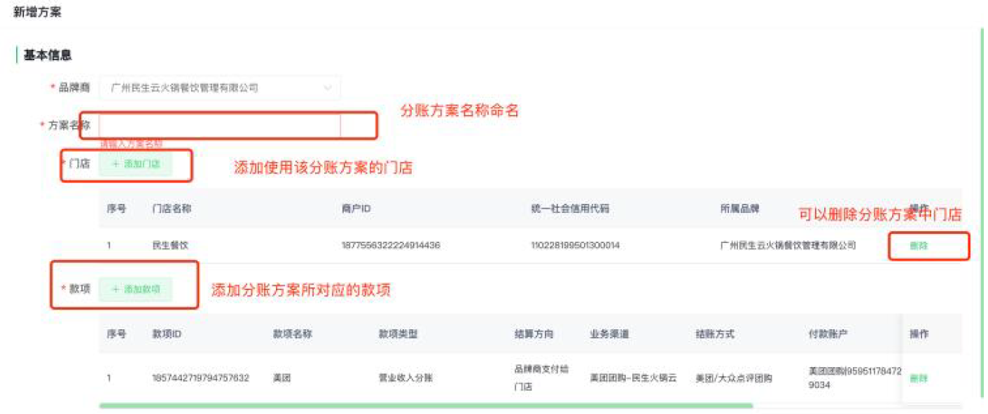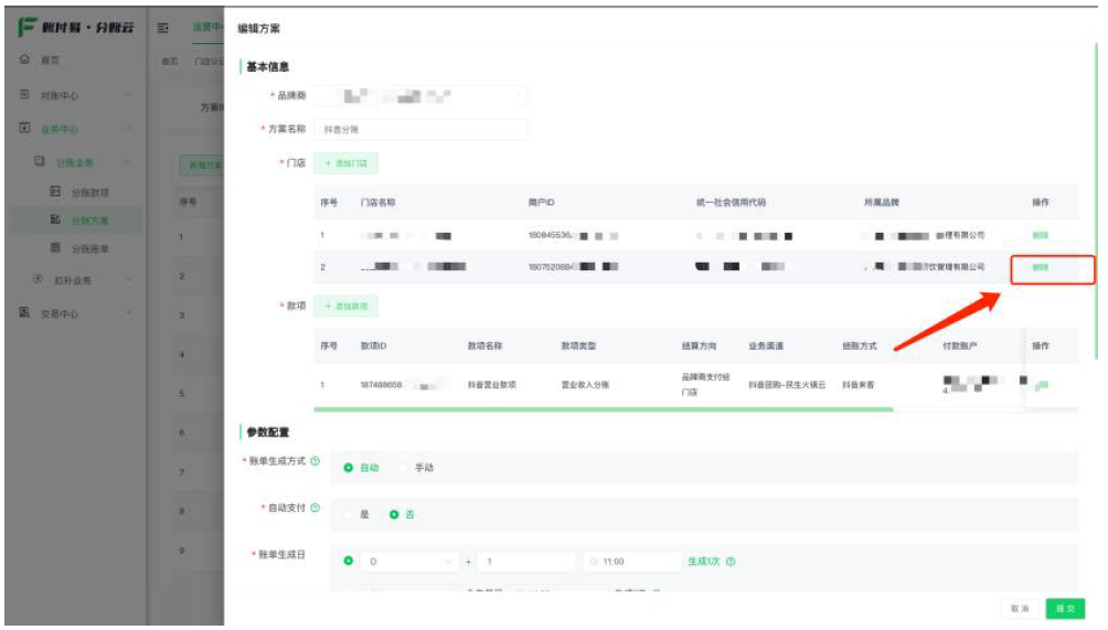 新增分账方案时,将适用于该方案的门店款项进行添加。设置相应的账单生成规则