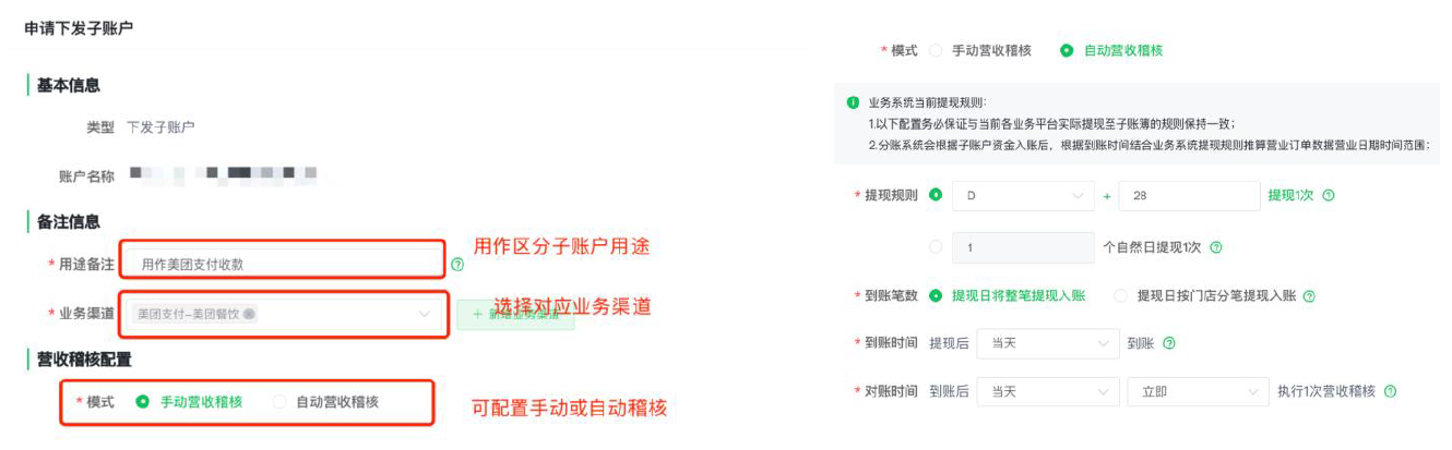 使用方法:需将创建好的下发子账户,绑定到各个业务平台,进行入账结算使用。这里需要根据不同平台进行分别创建,分平台绑定。