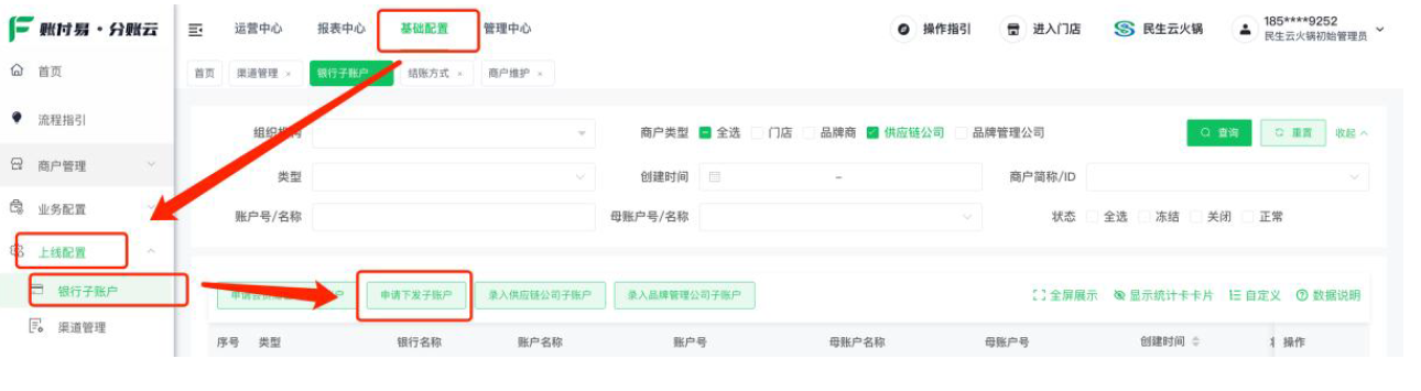 操作路径:账付易后台—基础配置—上线配置—银行子账户—申请下发子账户