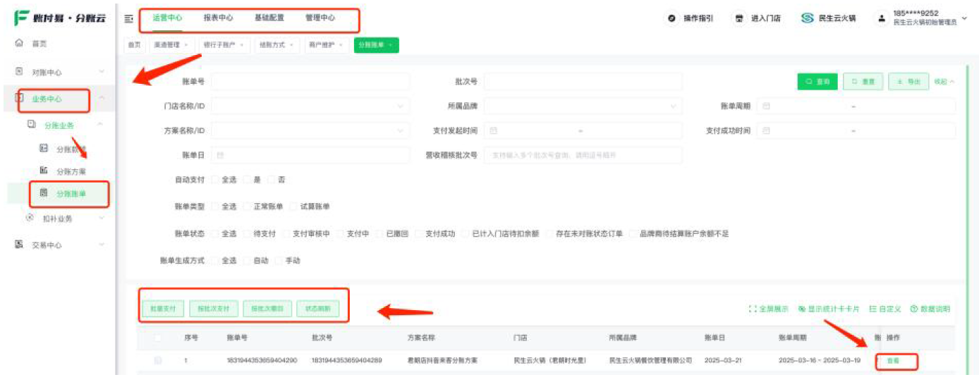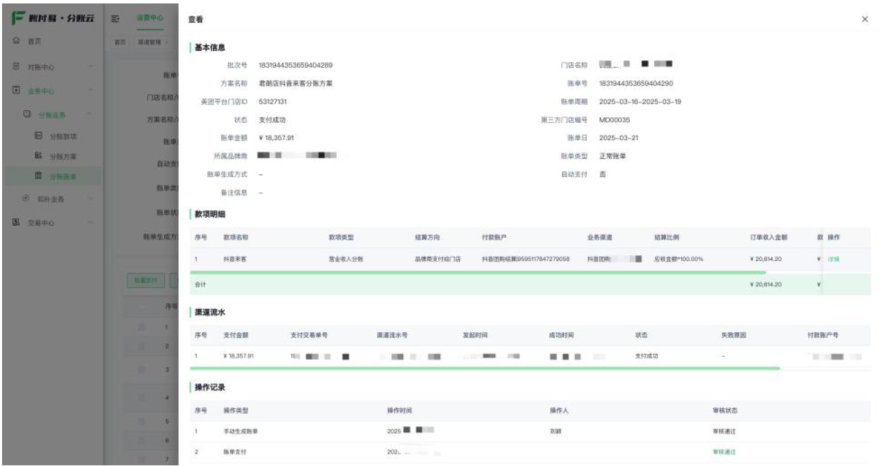 操作步骤:账付易后台—运营中心—业务中心—分账方案—操作按钮更多—生成账单
