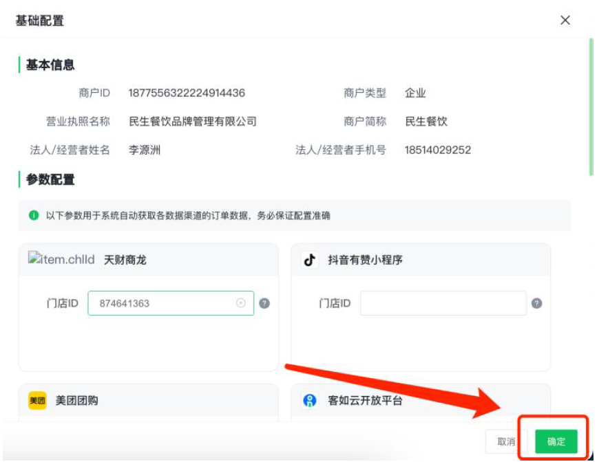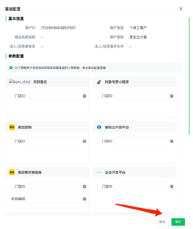 进入“基础配置”后如下图所示,填写后平台ID,“确定”即可