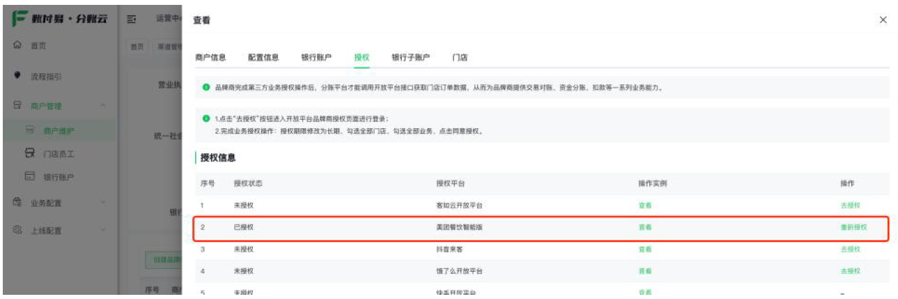收银系统授权步骤:账付易后台—基础配置—商户管理—商户维护—品牌商—详情中—授权配置