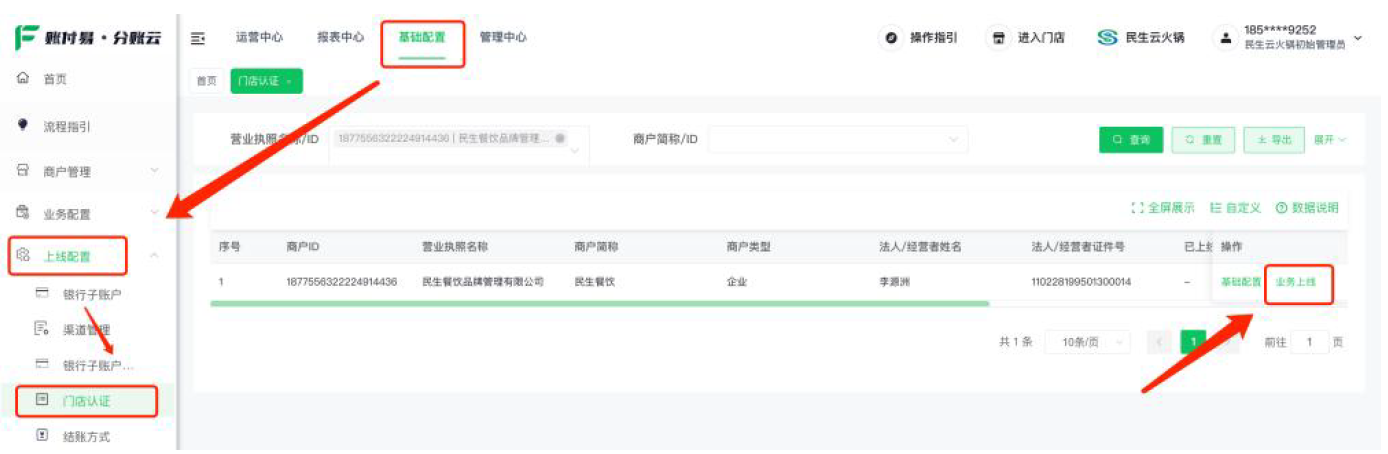 操作路径:账付易后台—基础配置—上线配置—门店认证—业务上线