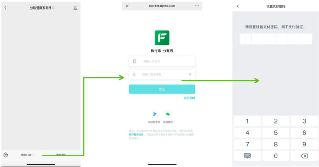 进入分账云助手,点击“我的门店”进行账号登录。首次登录时会提示设置支付密码,设置后进入