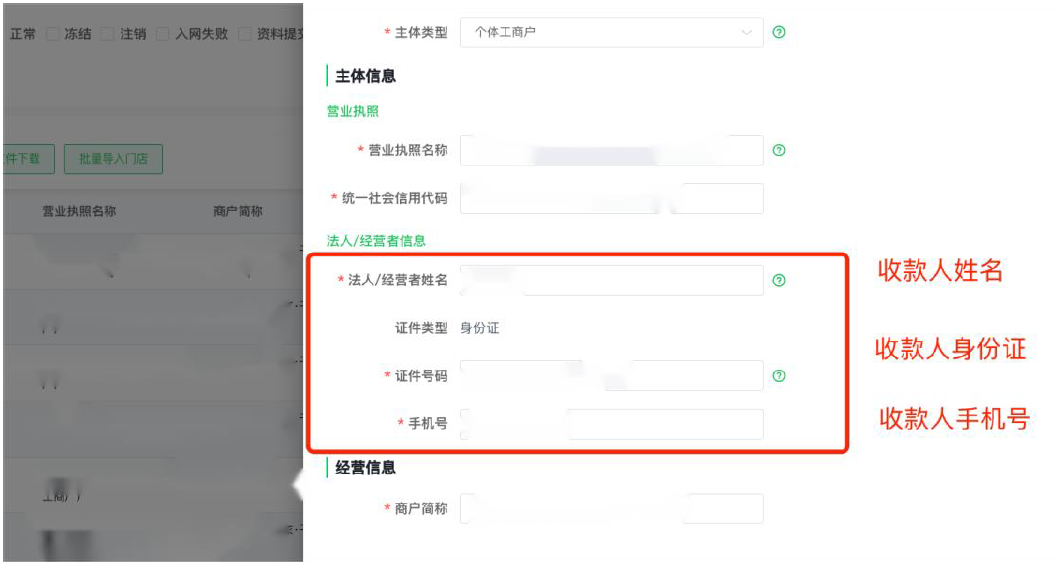 品牌总部根据门店新收款人信息需进行修改:法人/经营者姓名,证件号码,手机号