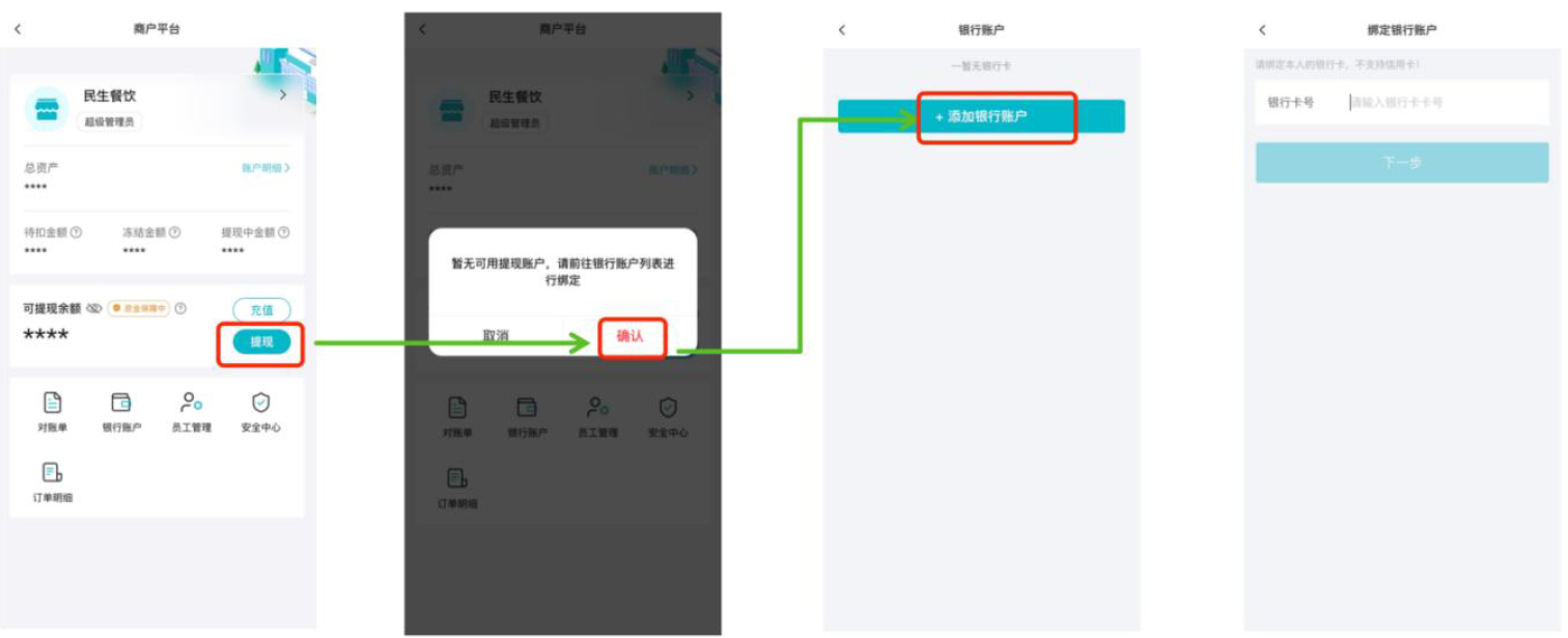 操作路径:登录到门店—点击“提现”—按照提示进入绑卡页面,按步骤添加银行卡即可