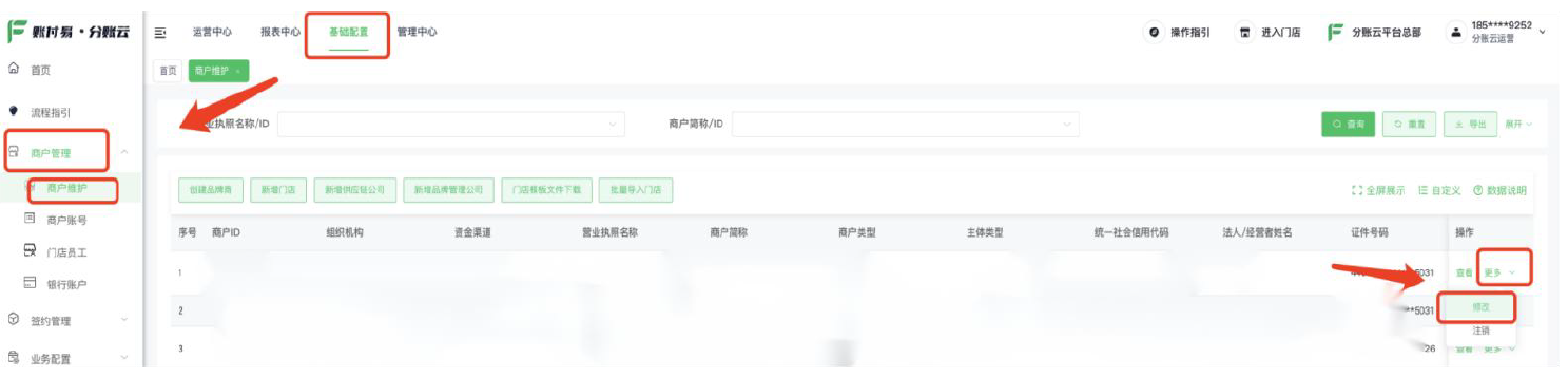 操作路径:账付易后台—基础配置—商户管理—商户维护—门店操作—更多—修改