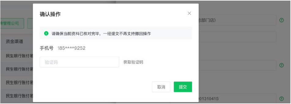 提交完成后,需要进行手机验证码验证(验证码会发到初始账付易门店手机号),点击提交