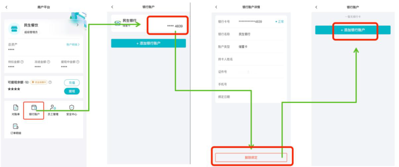 操作路径:登录到门店—银行账户—点击卡信息—可操作解除绑定。解除绑定后即可绑定新卡